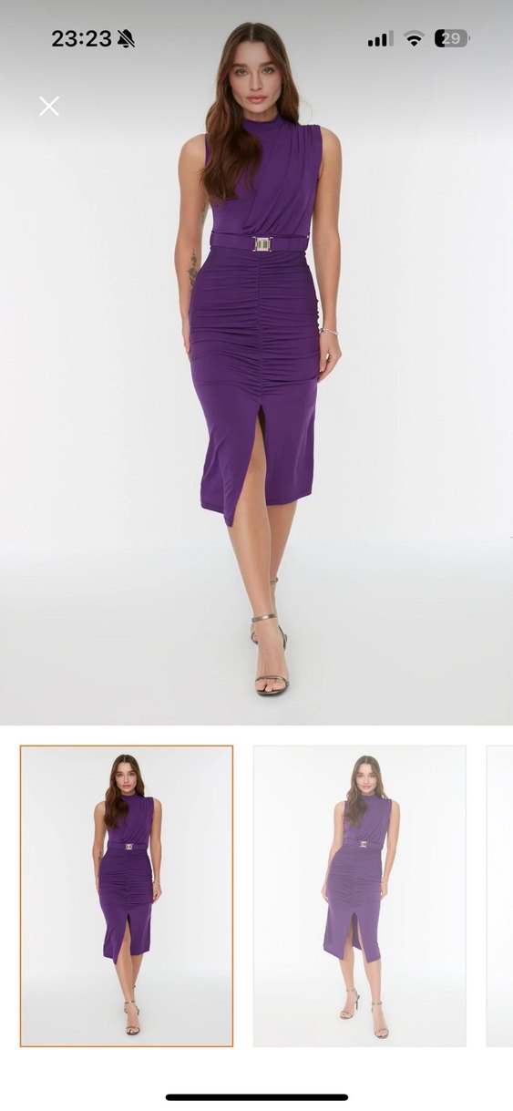 Uzun mor renkte, askılı ve drapeli detaylara sahip kalem elbise. V yaka ve ön yırtmaçlı, ipeksi dokulu kumaştan üretilmiştir. ✨