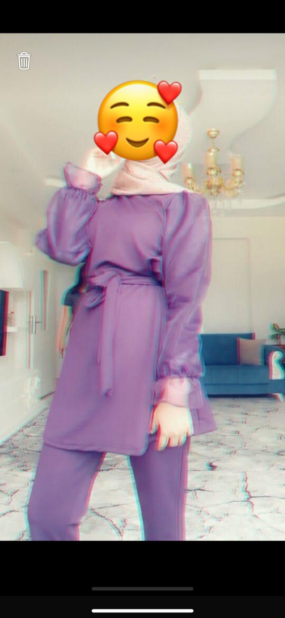 Mor uzun kol ve yüksek yakalı, bağcıklı, bol kesim takımdır. Yumuşak sentetik kumaştan, pastel tonlarda batik desenlidir. Minimalist, sokak stilinde şık ve rahat bir parçadır.