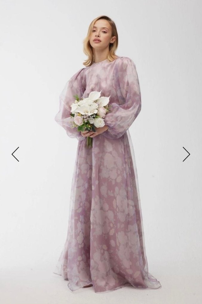 Uzun, dökümlü ve yüksek yakalı mor abiye elbise, uzun kollu ve pastel bağlama desenlidir. Çağdaş ve avangart bir tarz sunar. Bir kez kullanıldı defosu yoktur :) Manuka mağazasının abiye elbisesi