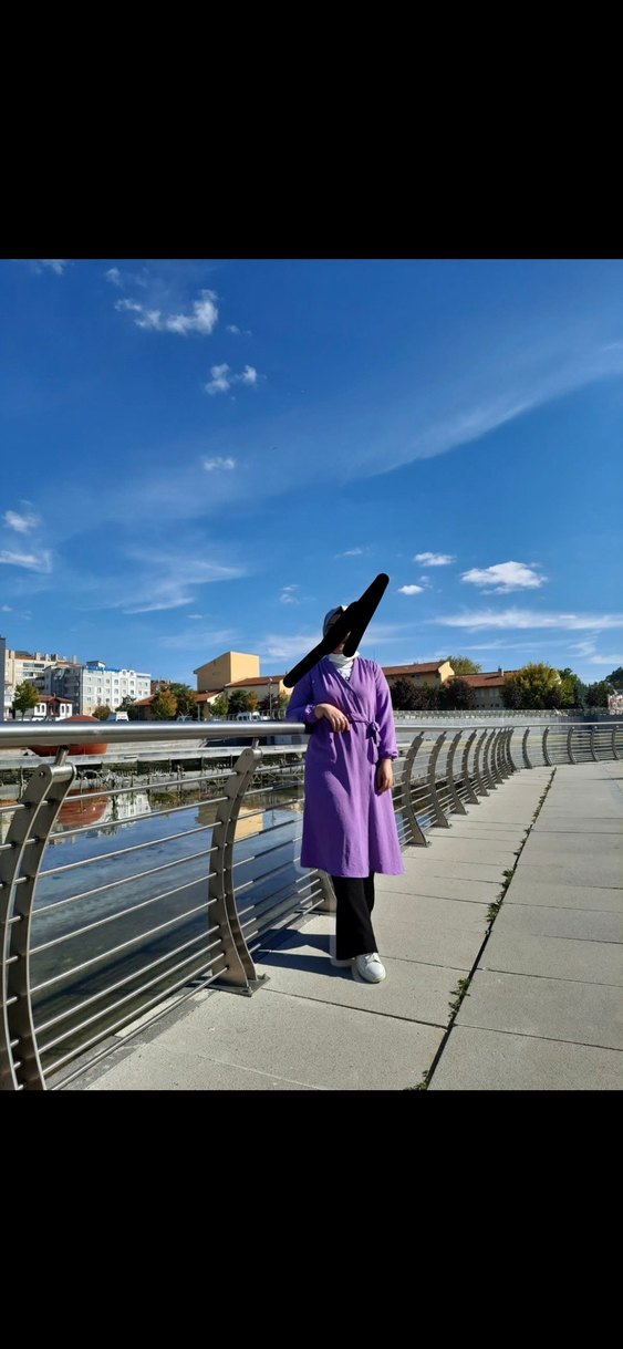 Uzun, mor bağlamalı ve parlak batik desenli yağmurluk. İpek gibi kumaştan, boğazlı ve uzun kollu, rahat kesim. ️
