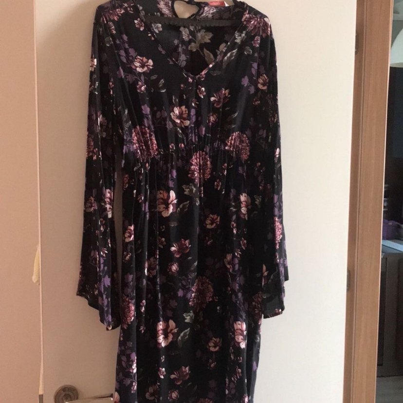 Uzun, bol kesim elbise, uzun kollu ve V yakalıdır. Yumuşak sentetik kumaştan, koyu mor bağlamalı çiçek desenlidir. Romantik gece için uygundur.