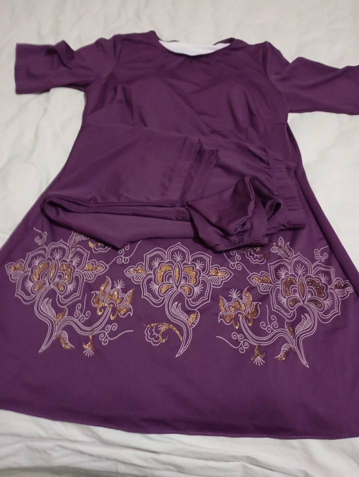 Uzun, mor renkli, baskılı desenlere sahip, dar kesim ve uzun kollu, yuvarlak yakalı, drapeli kadın hint elbisesi. Bohem tarzını yansıtır.