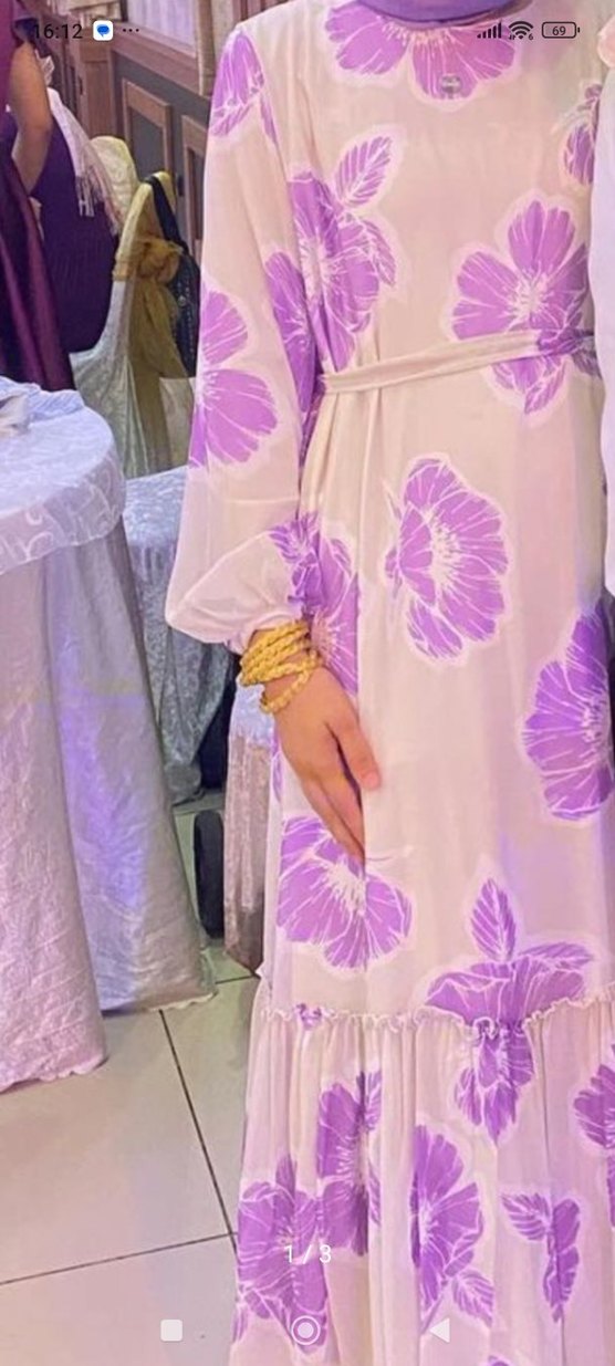Yüksek yakalı, uzun kollu, bol kesim ve drapeli detaylara sahip uzun mor elbise. Pastel tonlarda tie-dye deseniyle bohem tarzı yansıtıyor.