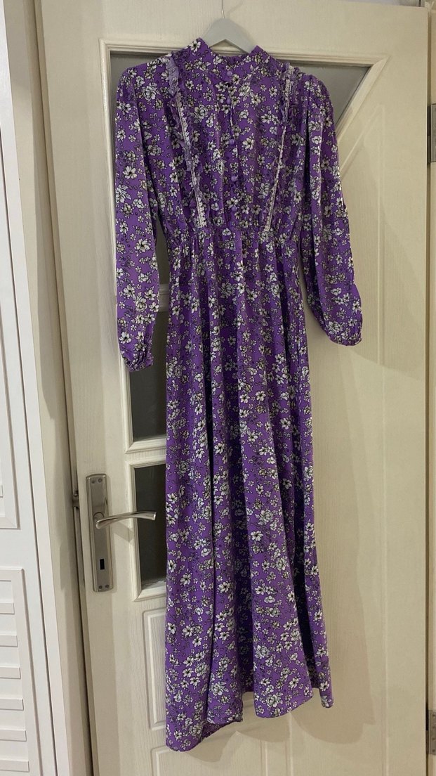 Bu uzun mor elbise, bol kesim ve drapeli detaylar, uzun kollu ve V yakalıdır. Koyu tonlarda tie-dye çiçek desenine sahip, yumuşak sentetik kumaştan yapılmıştır.