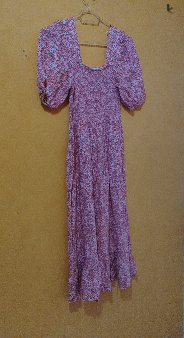 2defa giyildi günlük giyileblecek hoş bir elsbise Uzun mor elbise, bol kesim, fırfırlı ve tekne yakalıdır. Uzun kollu, pastel tonlarda batik desenlidir, günlük kullanım için uygundur.
