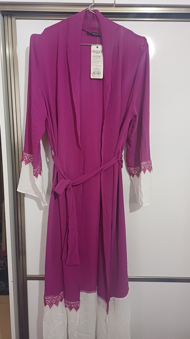 Uzun, mor renkte, bol kesim ve uzun kollu kadın abaya . Manşet ve etek uçlarında ince baskılı detaylar ve belde ayarlanabilir bağlama bulunur. kobe krep kumastir