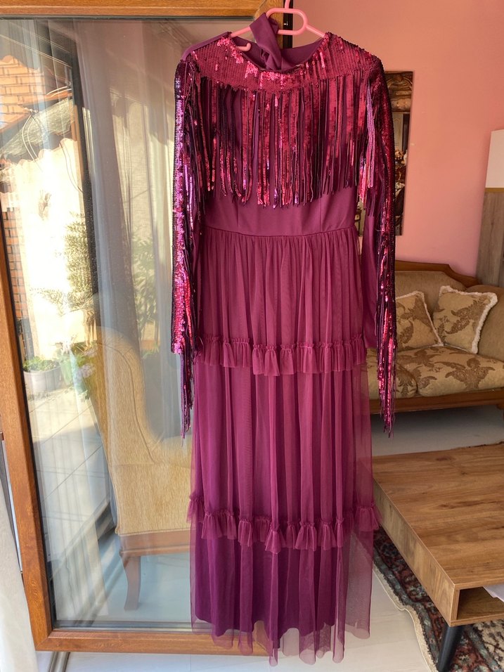 Bir kere giyilmiştir Bu uzun mor abiye elbise, parlak kumaş, fırfır detayları bohem parti tarzına uygundur.