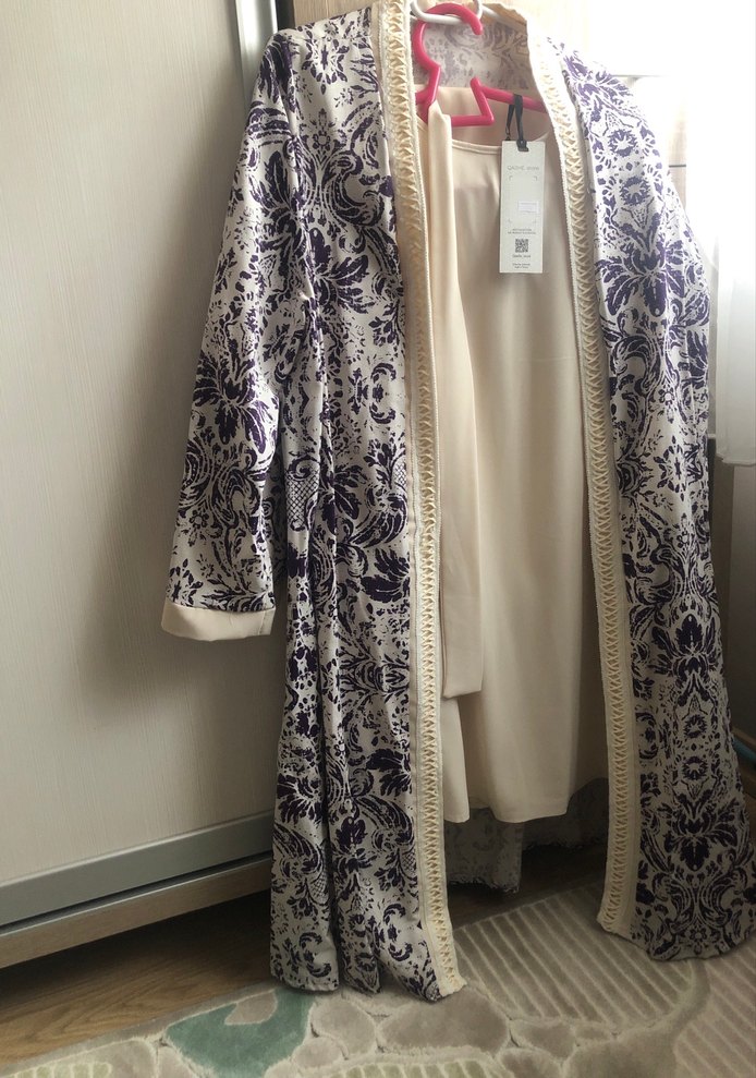 Uzun, bol kesim kadın kimono, hafif mor baskılı ipeksi kumaştan yapılmıştır. Uzun kollu ve yaka detaylı, bohem tarzda şık bir duruş sağlar.