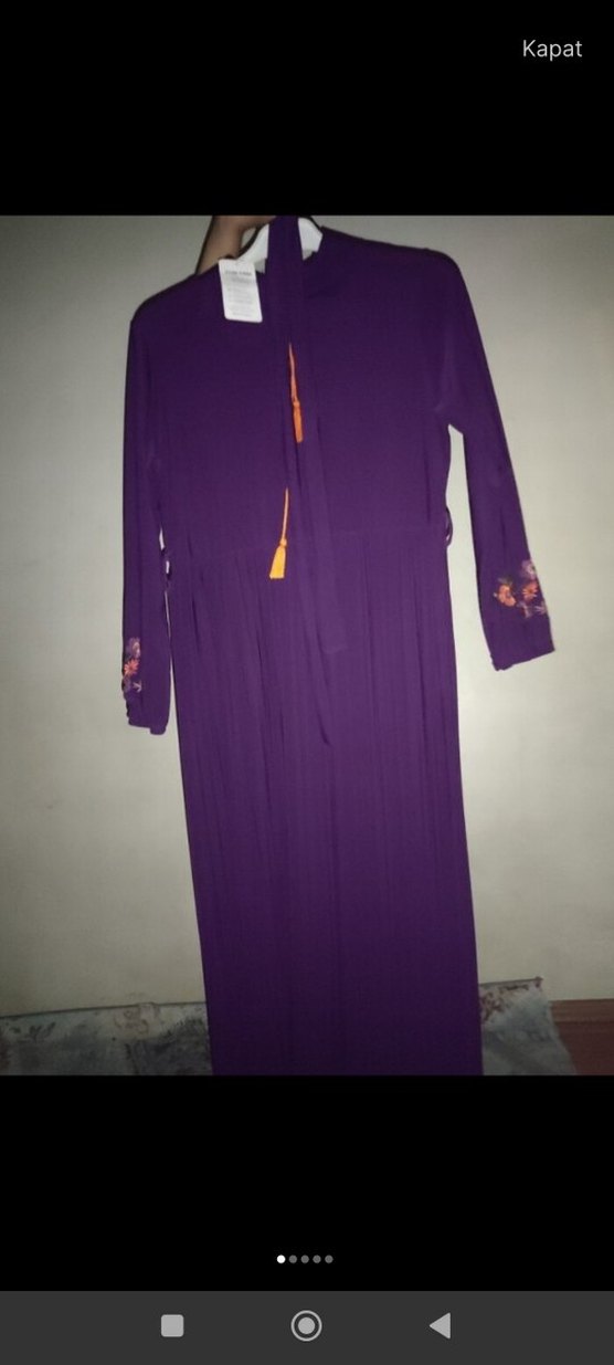 Yüksek yakalı, uzun kollu ve bol kesim mor elbise, nakışlı desenler ve püsküllerle bohem tarzını yansıtıyor.
