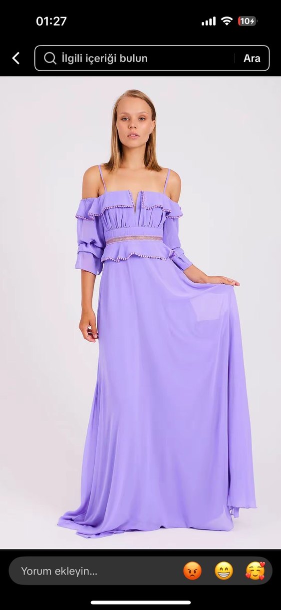 Uzun mor elbise, straplez yaka ve ince askılı kollara sahip. Fırfırlı detaylar ve nakış desenlerle bohem, retro tarzını yansıtır. Rahat kesim, düğünler için uygun.