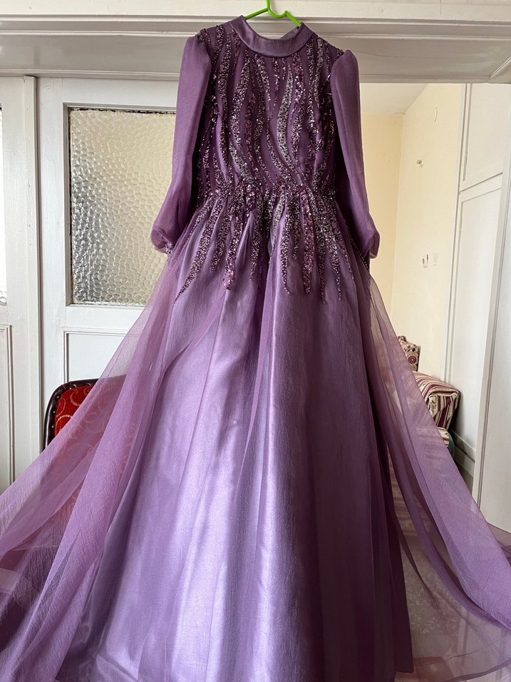 Uzun, bol kesim mor elbise, drapeli etnik desenli ve kapüşonlu yaka detaylıdır. Parlak kumaşı ve uzun kollu yapısıyla bohem düğün stilini yansıtır. Nişanımda bir kere giydim tertemiz tasarım elbise.durumu olmayan ve çok beğenen yazsın lütfen fiyatı konuşuruz