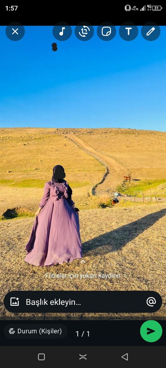 Uzun, mor renkte, yüksek yakalı ve uzun kollu, salaş kesim bohem tarzı sade elbise. Düğünlerde tercih edilebilir.