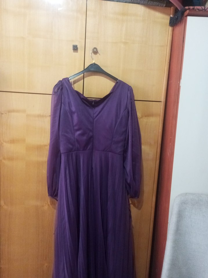 Uzun mor elbise, bol kesim, drapeli detaylar ve V yakaya sahiptir. Uzun kollu, parlak ve desensiz kumaştan, vintage düğünlere uygundur.
