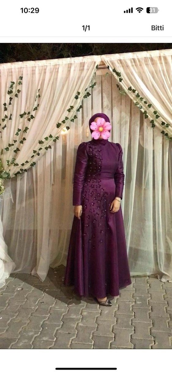 Uzun, dar kesim ve yüksek yakalı mor abiye elbise, çiçek desenli ve drapeli detaylara sahiptir. Düğünler için uygun, sade ve şık bir modeldir. Ürünü 2 3 kez giydim bir sorunu yoktur M/L beden