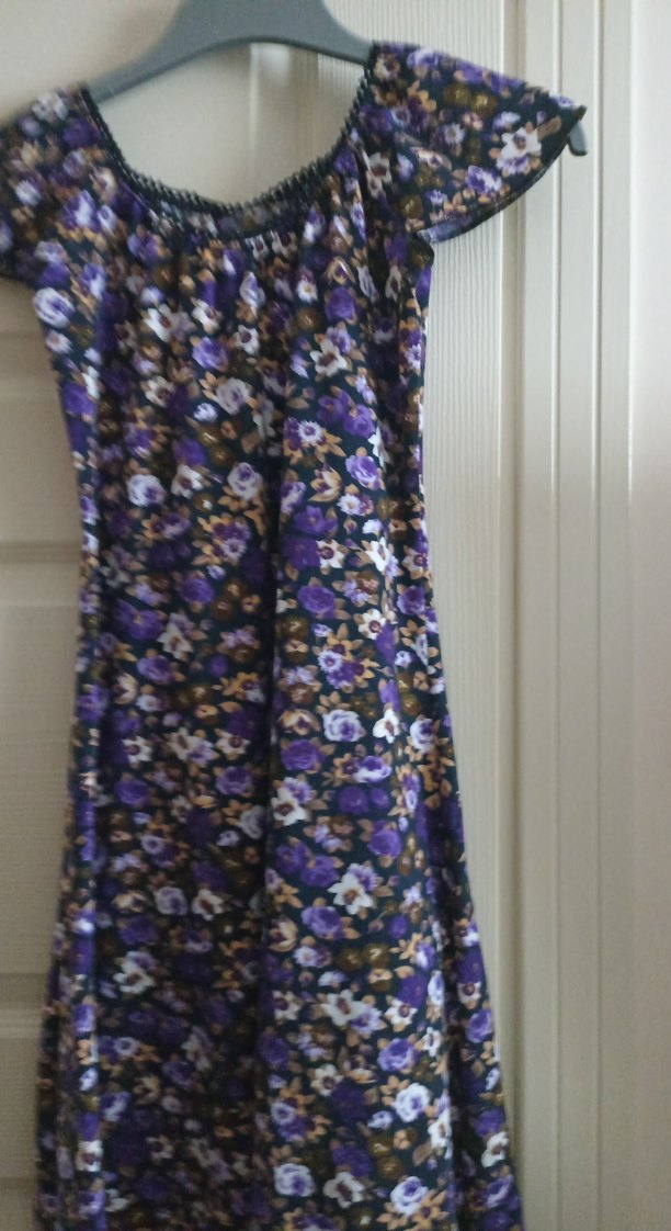 Uzun mor elbise, bol kesim ve drapeli tasarıma sahip, askılı kollu ve kayık yaka ile bohem çiçek desenlidir.