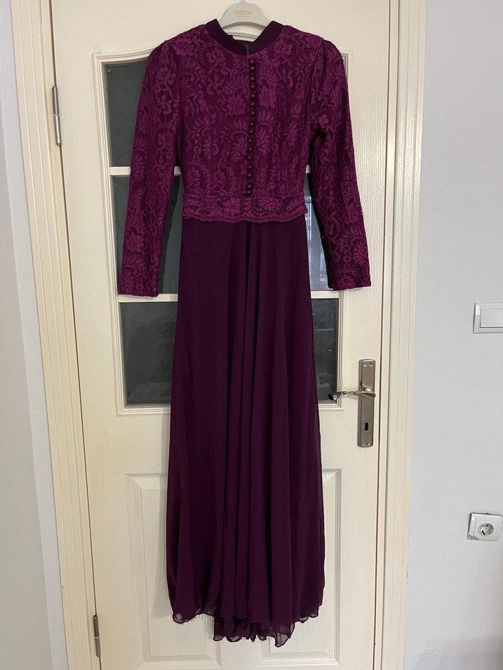 Uzun Mor Dantel Detaylı Kadın Elbise