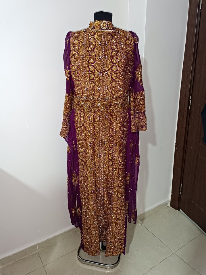 Uzun mor elbise, desenli, yüksek yakalı ve uzun kollu. Bol kesim ve drapeli yöresel abiye . 36-40 beden arası uygundur