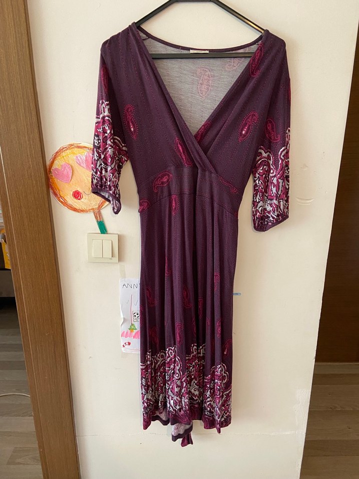 Yakasında çok minik bir delik var Uzun boy, bol kesim, koyu mor renkli, desenli, V yakalı Kullanılmış iyi durumda kadın elbise esnek kumaş 2 kol arası 44 boy 110 cm