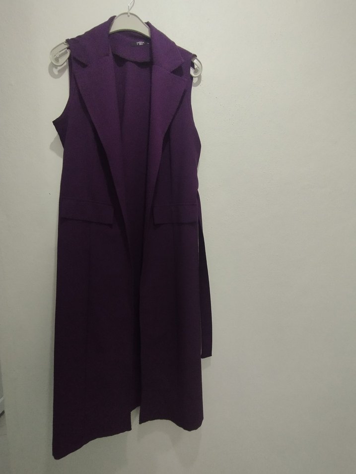 Uzun mor, kolsuz ve drape detaylı yaka tasarımlı yelek. Rahat kesim ve yumuşak, sıcak kumaş kullanılmış. Ofis ve gotik tarz için uygun.
