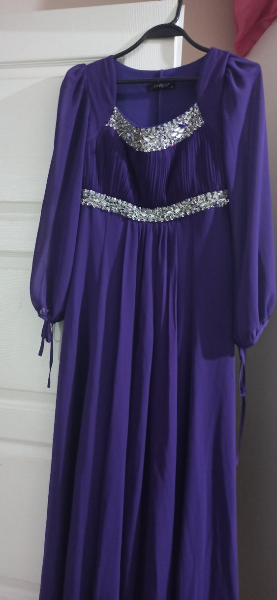 Uzun mor renkte, tek renk drapeli abiye elbise. Kayık yaka ve uzun kollu, bol kesimli. Bel ve göğüste parlak süslemeler bulunur, düğün için uygun.