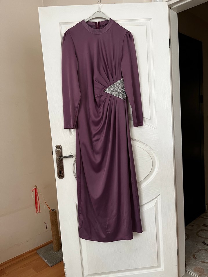 Yüksek yakalı ve uzun kollu, mor renkte uzun abiye elbise. Belde ışıltılı süslemeli drapeli ve vücuda oturan kesimiyle düğün için uygun. ✨ 38-40 beden aralığına uygundur giyilmedi