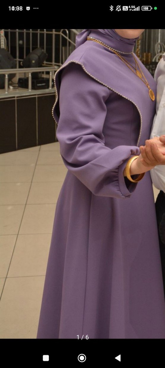 Drapeli ve kesimli, uzun kollu İpek gibi dokusu ve klasik, sade tasarımıyla pastel mor renkte, düğünler için uygun.