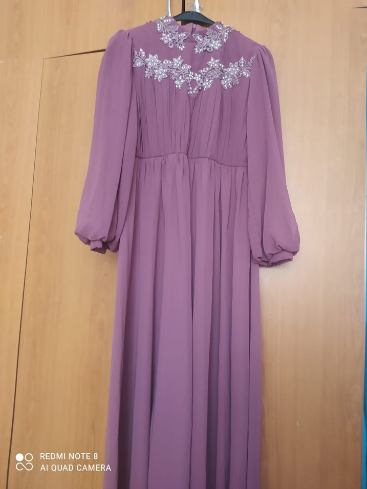 Uzun mor renkli elbise, drapeli tasarım ve işlemeli detaylara sahip, yüksek yakalı ve uzun kollu, bol kesim vintage tarzda. Düğünler için uygun. Ürün kullanılmadı yeni gibi tertemiz 46 beden elbise boy: 1.38