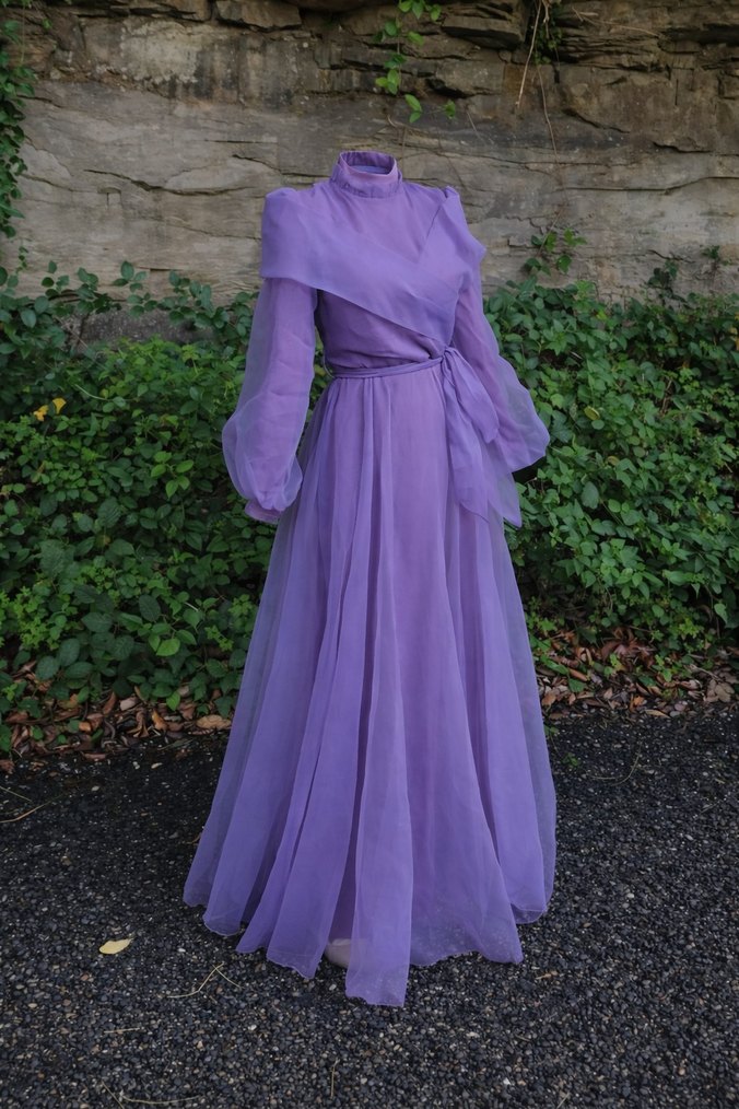 Uzun, bol kesim mor elbise, uzun kollu, yüksek yakalı ve drapeli kumaş detaylarıyla vintage tarzda düğünler için uygundur.