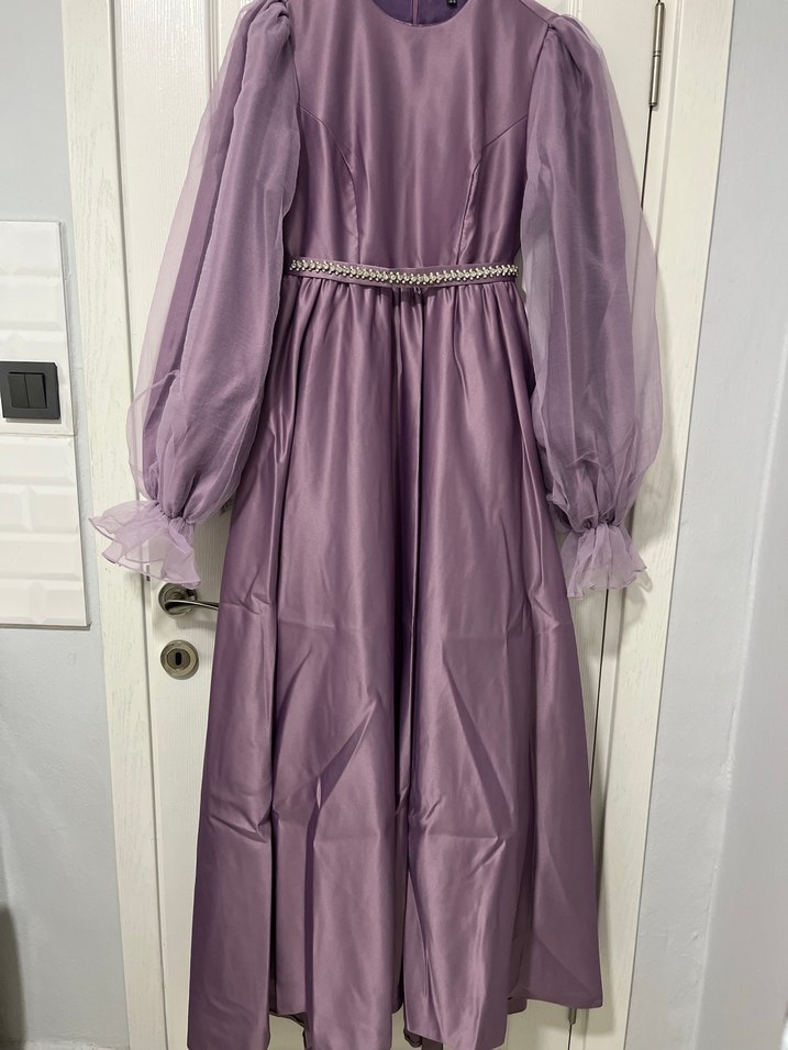 Uzun mor renkli abiye elbise, drapeli ve bol kesimdir. Uzun tül kolları, yuvarlak yakası ve vintage dokunuşlu modern klasik tarzı ile düğünler için uygundur.