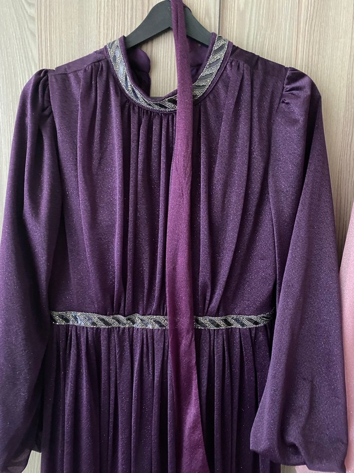 Aynı renk mor şalı mevcuttur.Bu uzun mor abiye elbise, yüksek yakalı ve drapeli tasarıma sahiptir. İnce kesimi, askılı kolları ve parlak dokusuyla düğünler için uygundur.