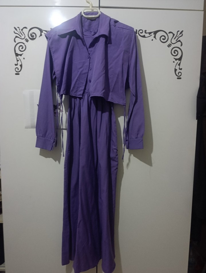 Uzun mor elbise, drapeli tasarımı, uzun kollu ve kesik yaka detayıyla, sentetik kumaştan, rahat bir kesime sahiptir.