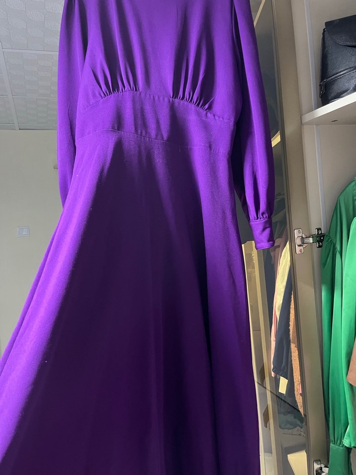Yüksek yakalı, uzun kollu ve bol kesimli uzun mor elbise. İpeksi kumaştan, drapeli tasarıma ve parlak görünüme sahip, düğünler için uygun.