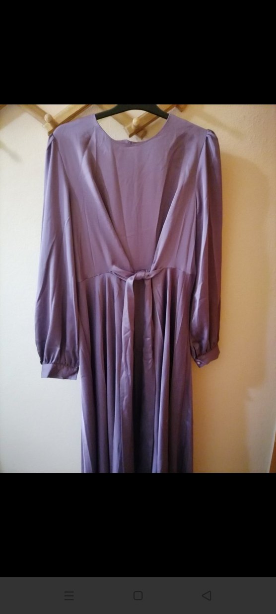 Uzun, mor tonunda, dökümlü ve satenimsi kumaştan kadın elbisesi. V yaka ve askılı kollu, vintage bohem tarzda, düğün için uygun klasik bir model.