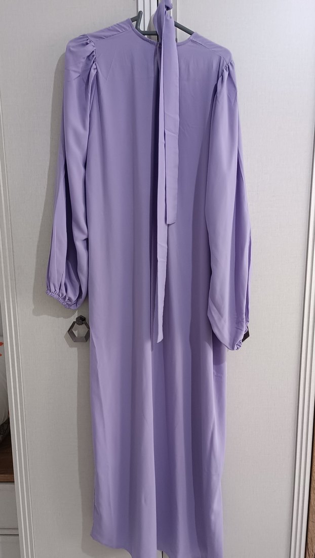 Uzun mor renkte, drapeli tasarıma sahip kadın elbisesi. Uzun kollu, yüksek yakalı ve rahat kesimdir. Günlük kullanıma uygun, sade ve mütevazı stilde, yumuşak sentetik kumaştan üretilmiştir. görünmediğini ipeğidir seyyar kemerlidir astarı yoktur arkadan düğmelidir kolları lastiklidir hafif efil efil bir kumaşı vardır. günlük kullanıma da şık giyme de uygundur