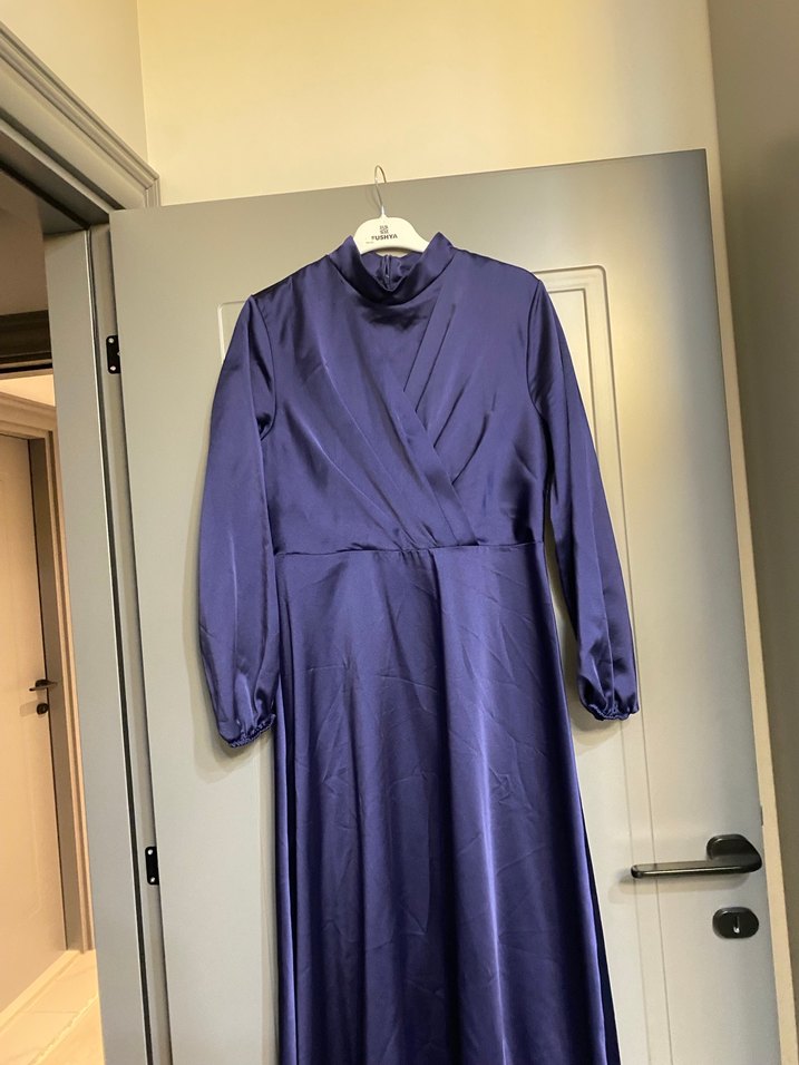 Uzun mor renkli, yüksek yakalı ve uzun kollu kadın elbisesi. Drapeli tasarımı ve parlak dokusuyla modern klasik ve sade bir şıklık sunar.