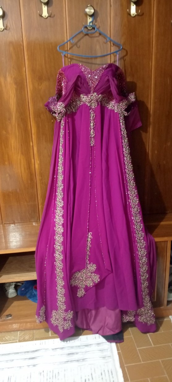 Uzun mor renkte, parlak desenli ve drapeli tasarıma sahip straplez kadın abiye. Uzun kollu ve bol kesim, düğünler için uygundur. ✨ kolları açık