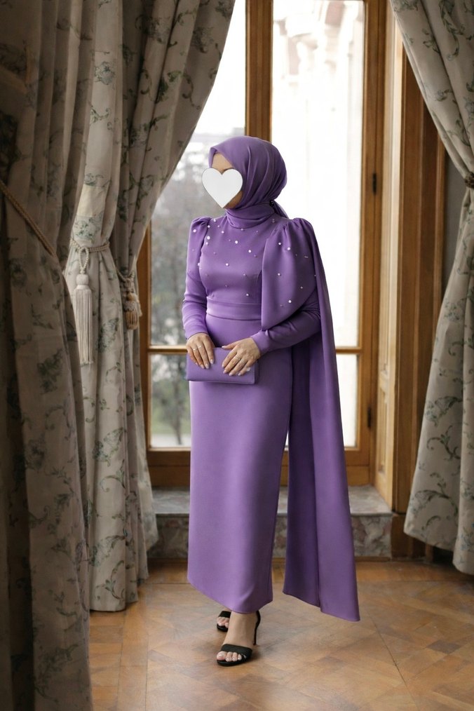 Uzun Mor Drapeli Tesettür Abiye Elbise