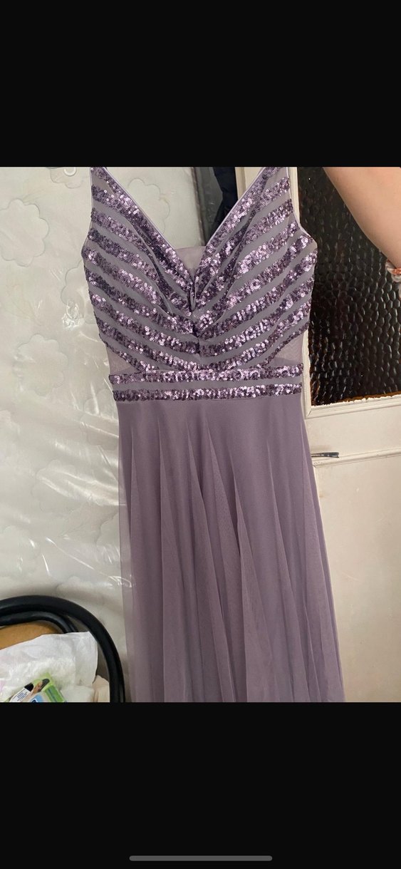 1 kere giyildijj ne Uzun mor abiye elbise, drapeli V yaka ve kolsuz, vücuda oturan kesime sahiptir. Üst kısmı baskılı payetlerle süslenmiştir. Düğün ve şık etkinlikler için uygundur.