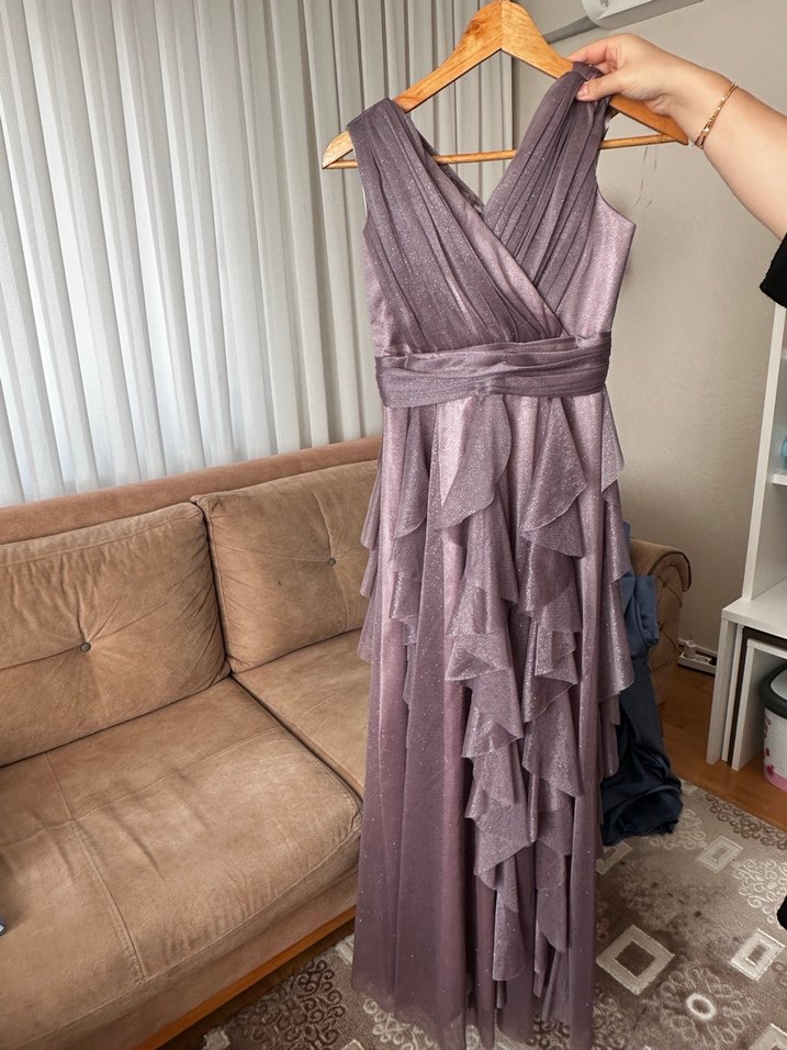 Uzun mor renkli, drapeli ve v yaka askılı, vücuda oturan kesime sahip abiye elbise, düğün için uygundur. ✨