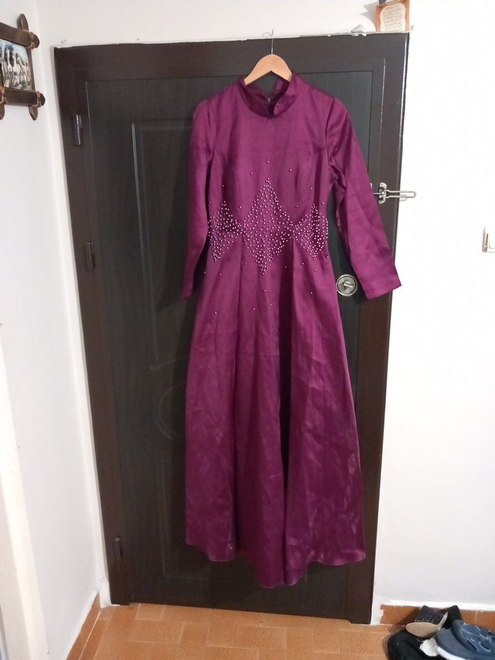 Parlak kumaşlı, uzun mor drapeli elbise. Yüksek yakalı, uzun kollu ve bol kesim vintage gotik tarzda, düğünlere uygun. ✨