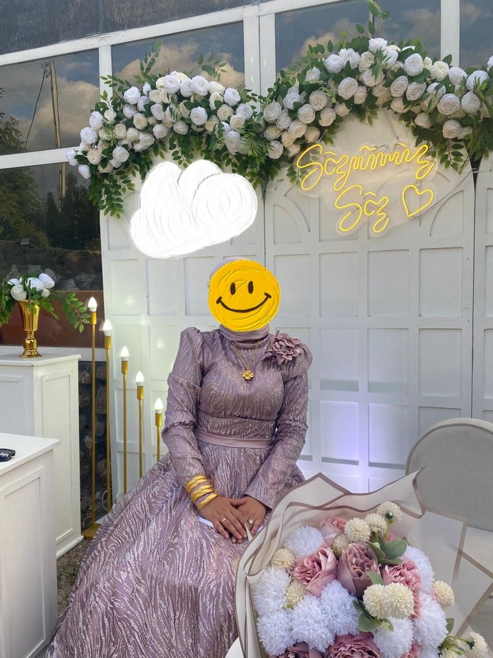 iki kere giyildi temiz Yüksek yakalı, uzun ve drapeli hafif kabarık prenses model bu nişan elbisesi pastel mor tie-dye deseniyle dikkat çekiyor. İnce askılı ve avant-garde tarzda, mütevazı ve sıra dışı bir görünüm sunar.