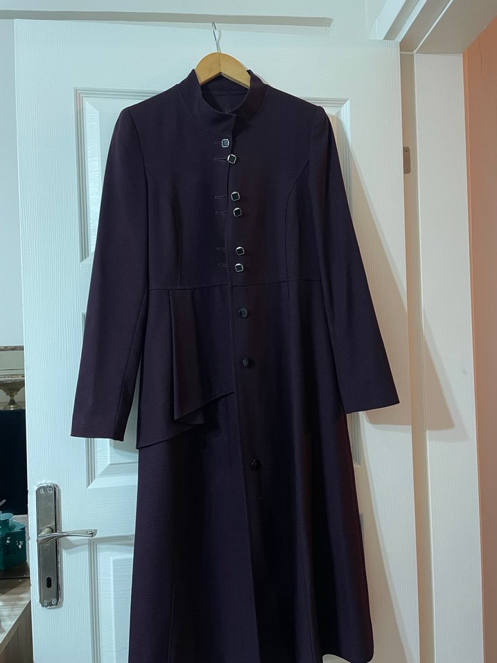 Uzun, koyu mor renkli bu kaban, düğmeli ön kısmı ve kesik yakası ile şık bir parça. Boyu 112 cm içi astarlı