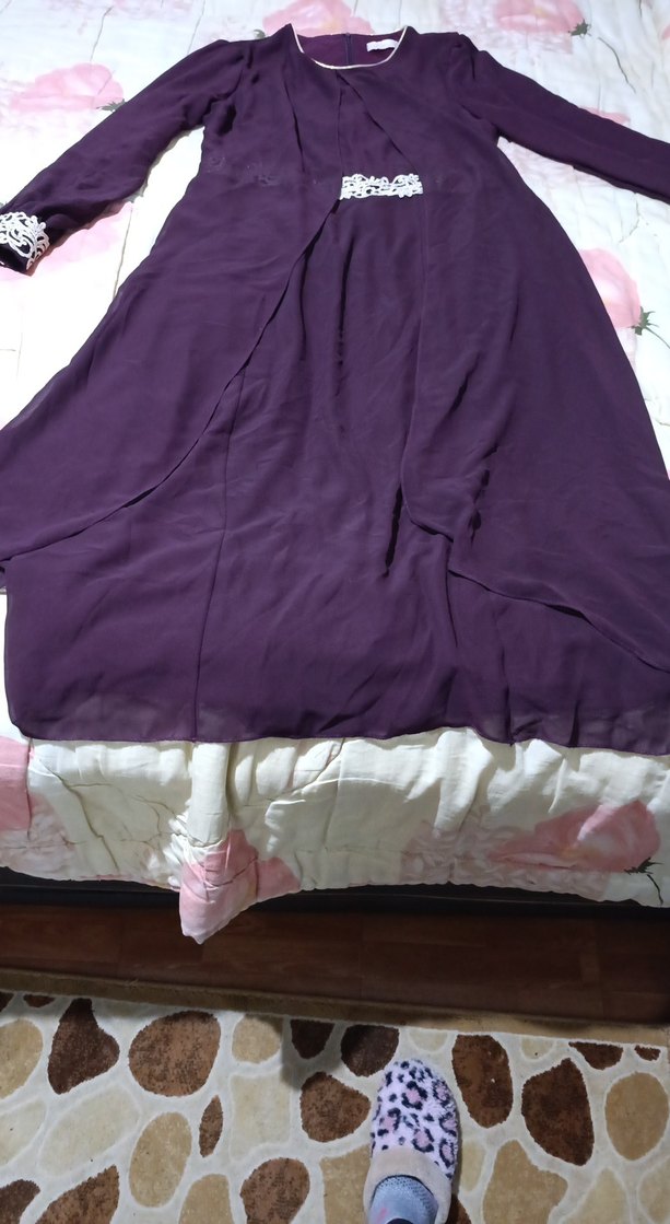 Uzun ve bol kesim mor straplez yaka ve uzun kolludur. Kollarda ince dantel detayları bulunur.