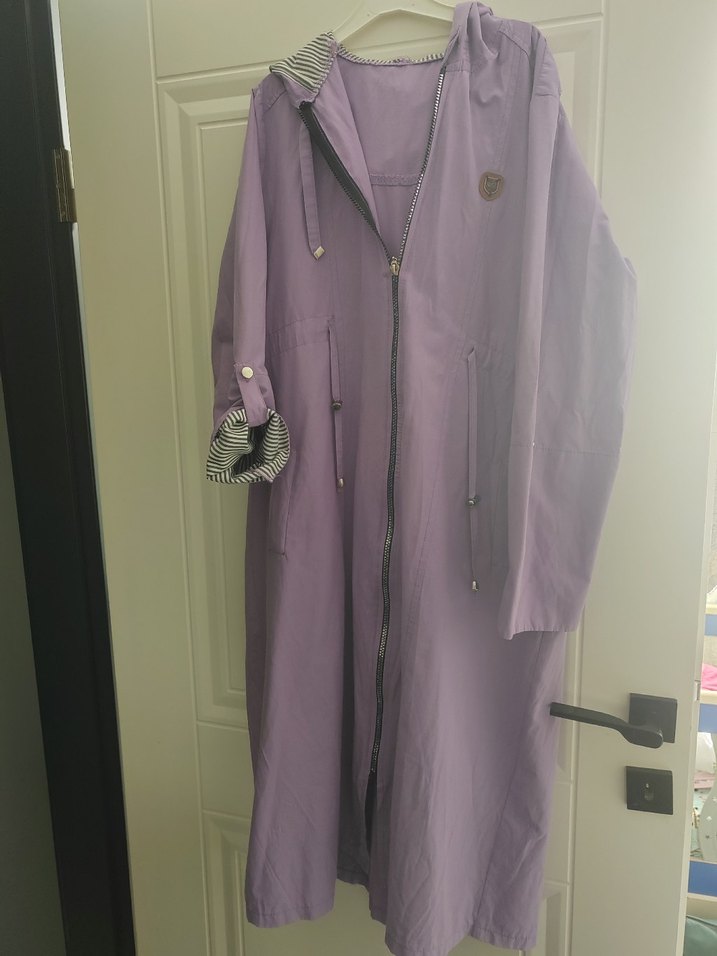 Uzun, bol kesim mor renkli kadın yağmurluğu fermuarlı ön ve çıtçıtlı kol detayına sahiptir. Sentetik kumaştan üretilmiş, uzun kolludur ve günlük sokak stiline uygundur. ️