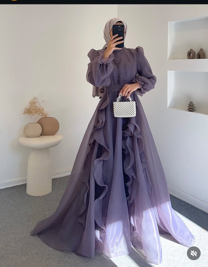 Mor renkte, uzun, fırfırlı ve yüksek yakalı abiye elbise. Salaş kesimi ve askılı kollarıyla düğünler için uygundur. Etiketi üzerinde sıfır