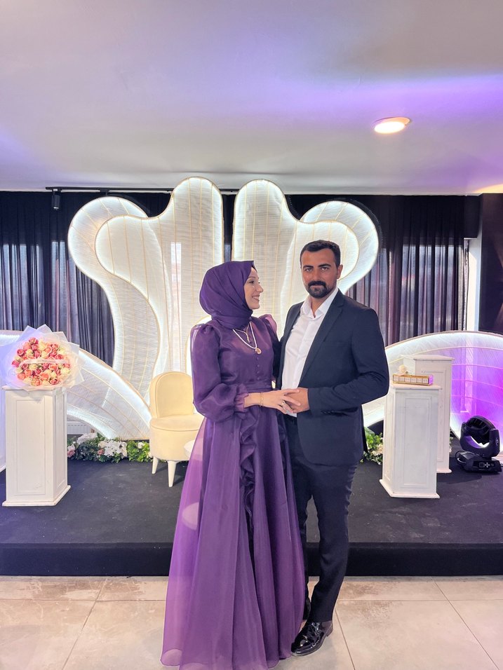 Uzun boy, bol kesim ve fırfır detaylı mor abiye elbise. boyum:170 kilo:60