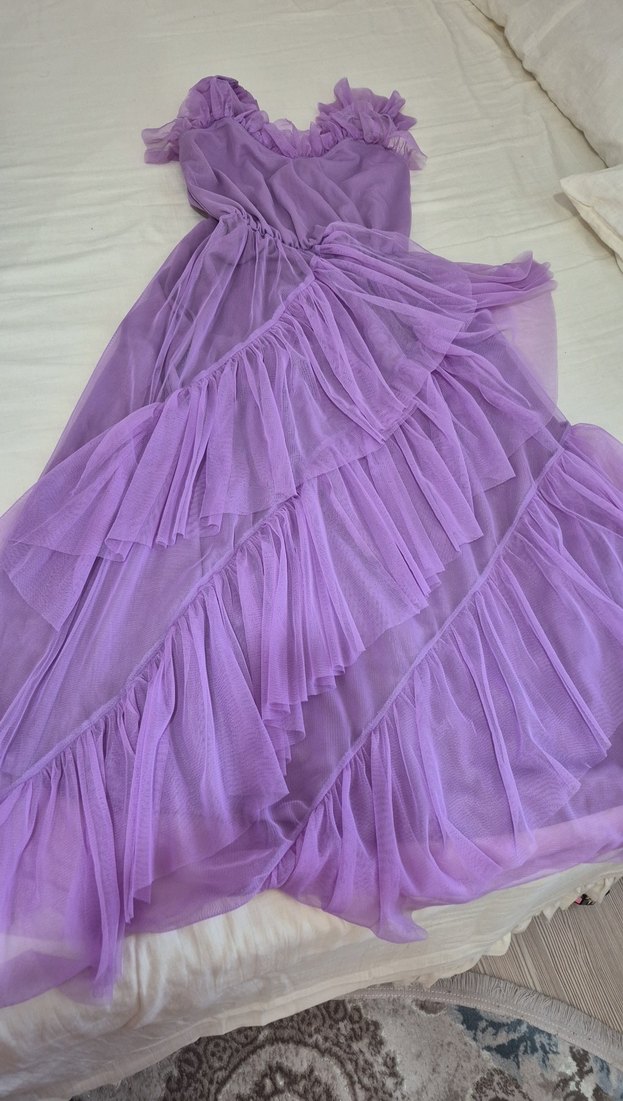 Uzun mor renkte, askılı, kayık yaka ve bol kesimli, kat kat fırfır detaylı bohem tarzda abiye elbise.