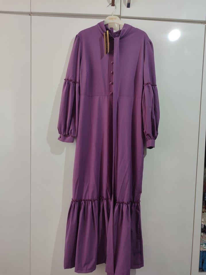Uzun, bol kesim elbise, yüksek yakalı ve uzun kolludur. Kollarında ve etek ucunda fırfırlar bulunur. Yumuşak sentetik kumaştan yapılmış pastel mor renktedir.