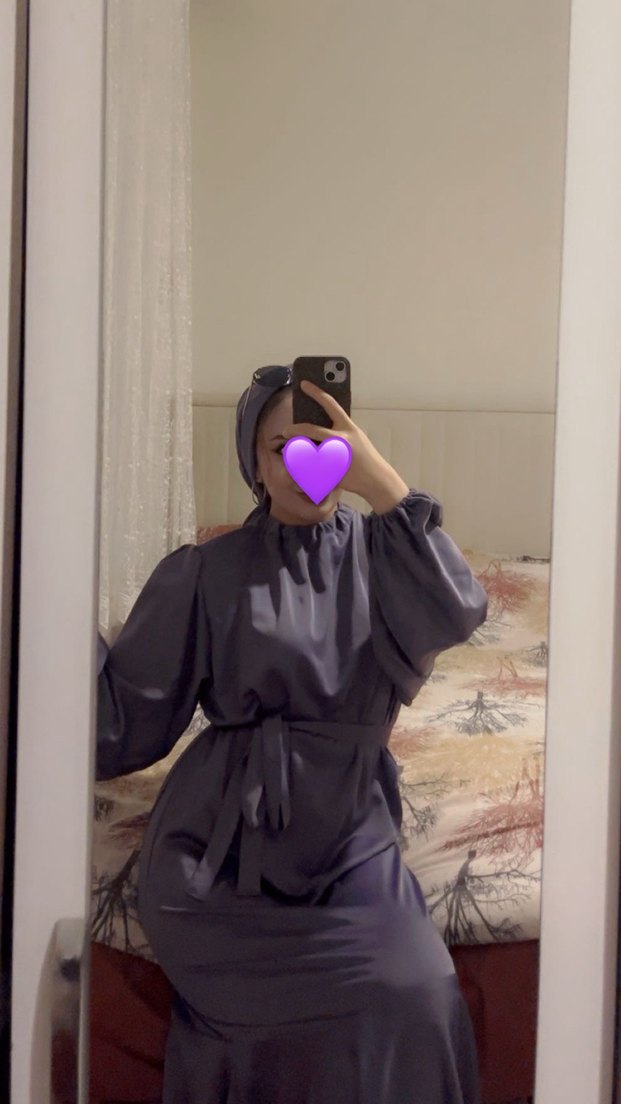 Yüksek yakalı, uzun kollu ve salaş kesimli uzun mor elbise. İpek gibi kumaştan, bağlamalı ve batik desenlidir, günlük şıklık sunar.