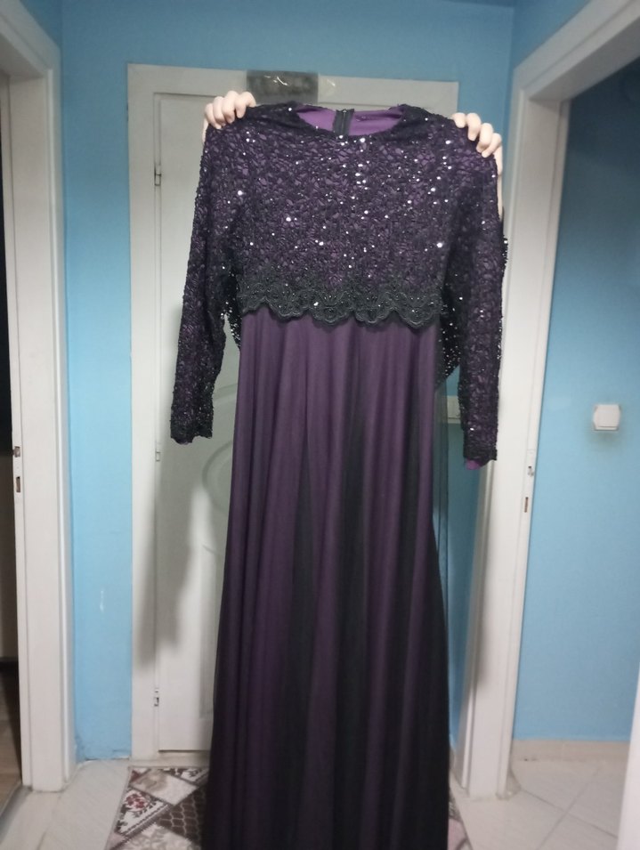 Bu uzun mor abiye elbise, straplez yaka ve uzun kollu, vücuda oturan kesime sahiptir. Üst kısmı koyu renkli pul işlemeli drapeli detaylarla gotik tarzda, düğünler için uygundur.